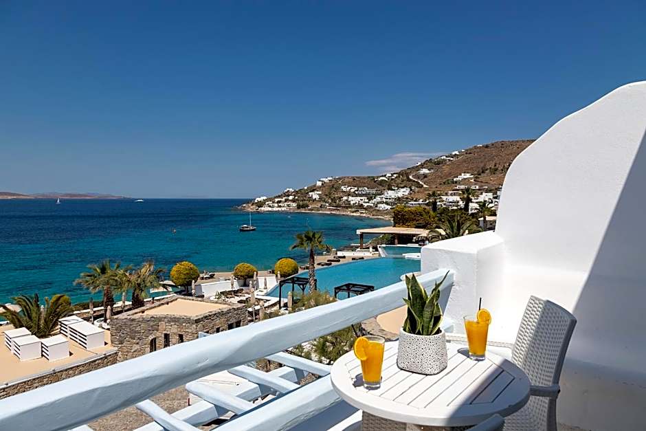 One-Bedroom Villa with private pool, living room, two bathrooms with spa bath and steam shower and mini bar. The villa is 80m2 with a 130m2 veranda. It offers a view of the private beach and island of Dilos. Please note that it is located 492 feet from the main building.